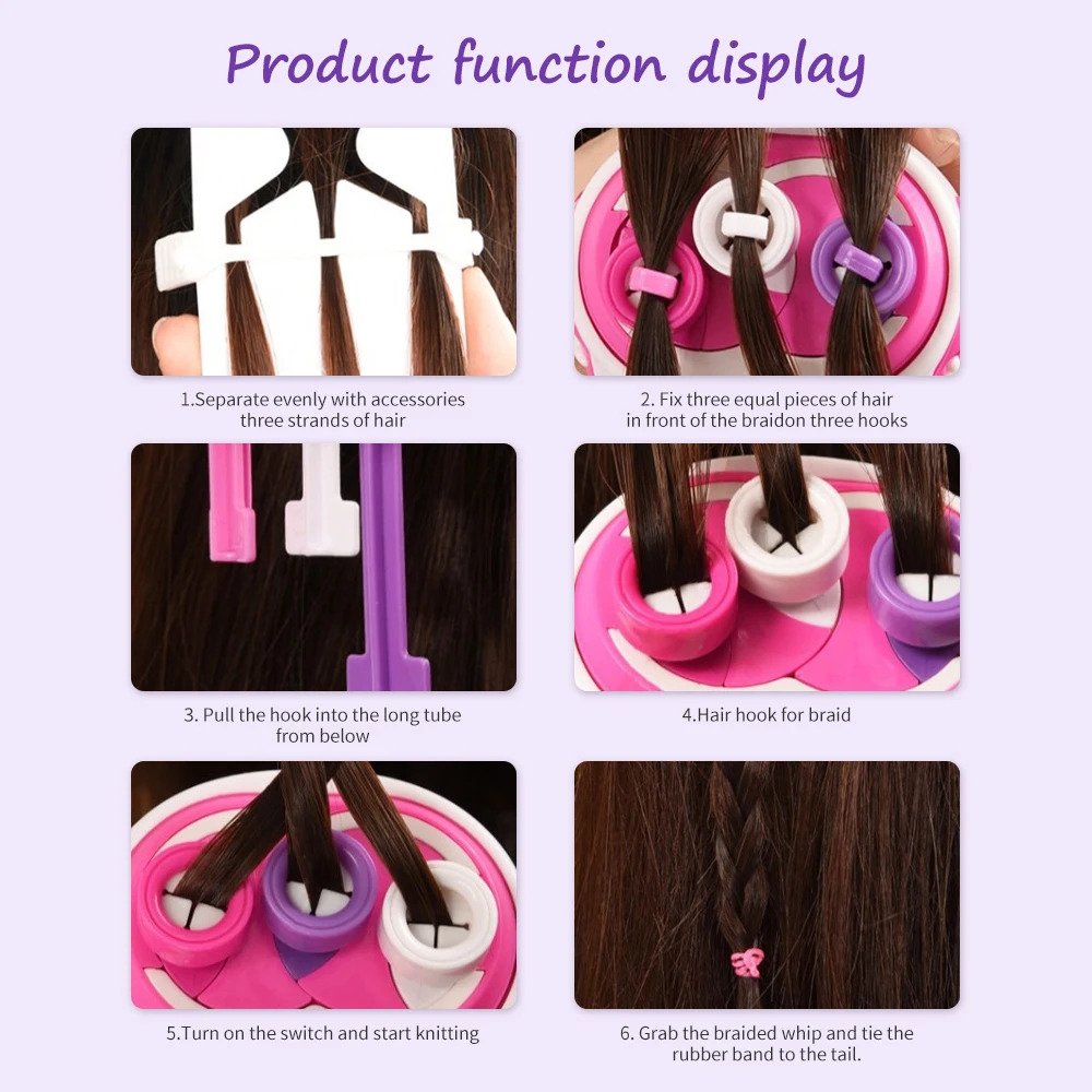 2.With this automatic hair braid tool, only 6 simple steps. Steps: 01 evenly separate with accessories, three strands of hair; 02 fix three equal hairs on the three hooks in front of the braid; 03 pull the hook into the long tube from below; 04 hair hook into the hook of the braid; 05 start the switch, start Braid; 06 Grab the braided whip and tie the rubber band to the tail just fine.